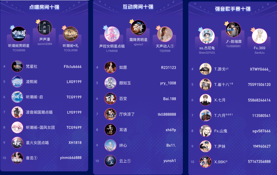 不少用户通过这次活动,关注到了多个优质语音厅和歌手。其中,还有才开厅不到一个月的新人,如“霜降男明星”,最终拿下了“互动房间十强”的第一名,歌手陈瑞霖也拿下了“强音歌手赛十强”的第一名。