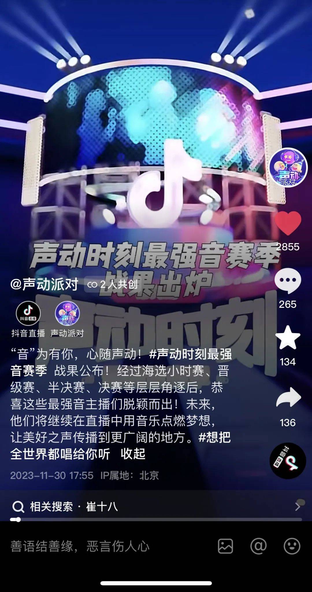 据了解,“声动时刻最强音”是抖音直播面向语音赛道的年度赛事活动,为一年一次的特别版,意在为语音主播提供更大的舞台。