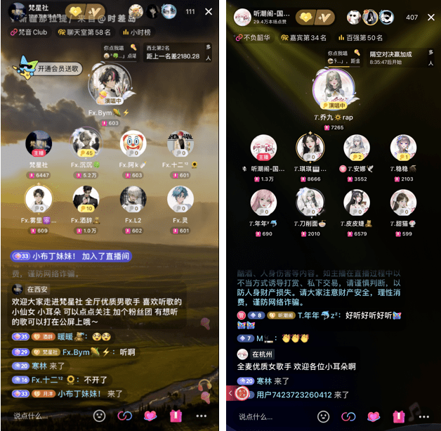 如今,经过多年的发展,抖音语音直播越来越规范化、专业化,内容生态也越来越成熟,出现了越来越多优质语音厅及歌手,如声声漫、听潮阁、梵星社等,聚集了一群具有出色音乐才华的歌手们。
