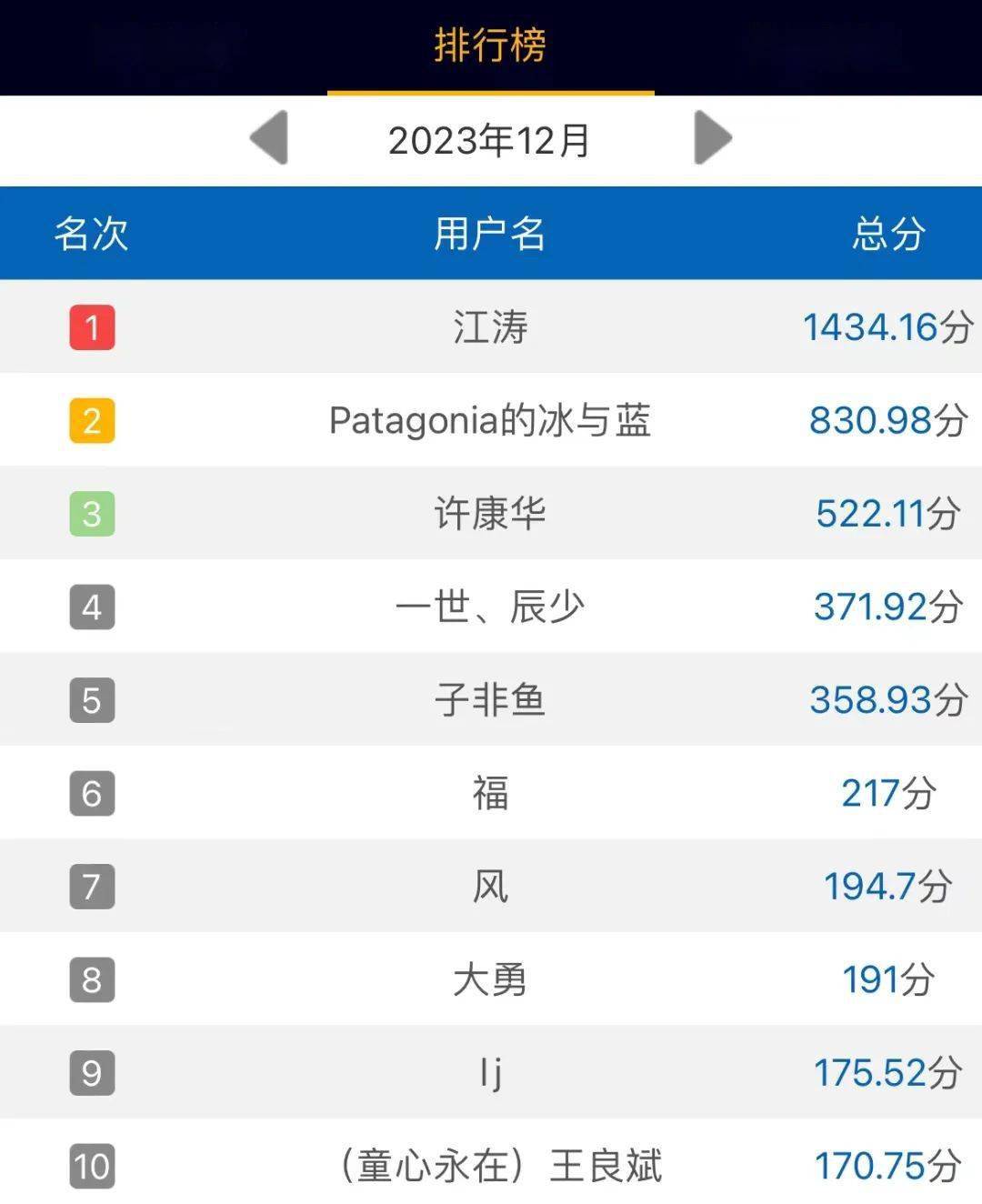 昵称“江涛”的选手赢的了昨天的最多积分,他命中一单2串1,投入100分,赢到了1035分,10.35倍!反超“冰与蓝”夺回了榜首位置。