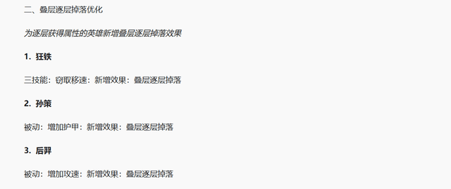 还有三个英雄增加了逐层掉落的效果,狂铁大招获得的移速逐层掉落,孙策被动护甲逐层掉落,后羿被动攻速逐层掉落。三个英雄的调整属于加强,孙策此次被提起,说明他的新皮肤马上要来了,后续还会有一波大的加强。