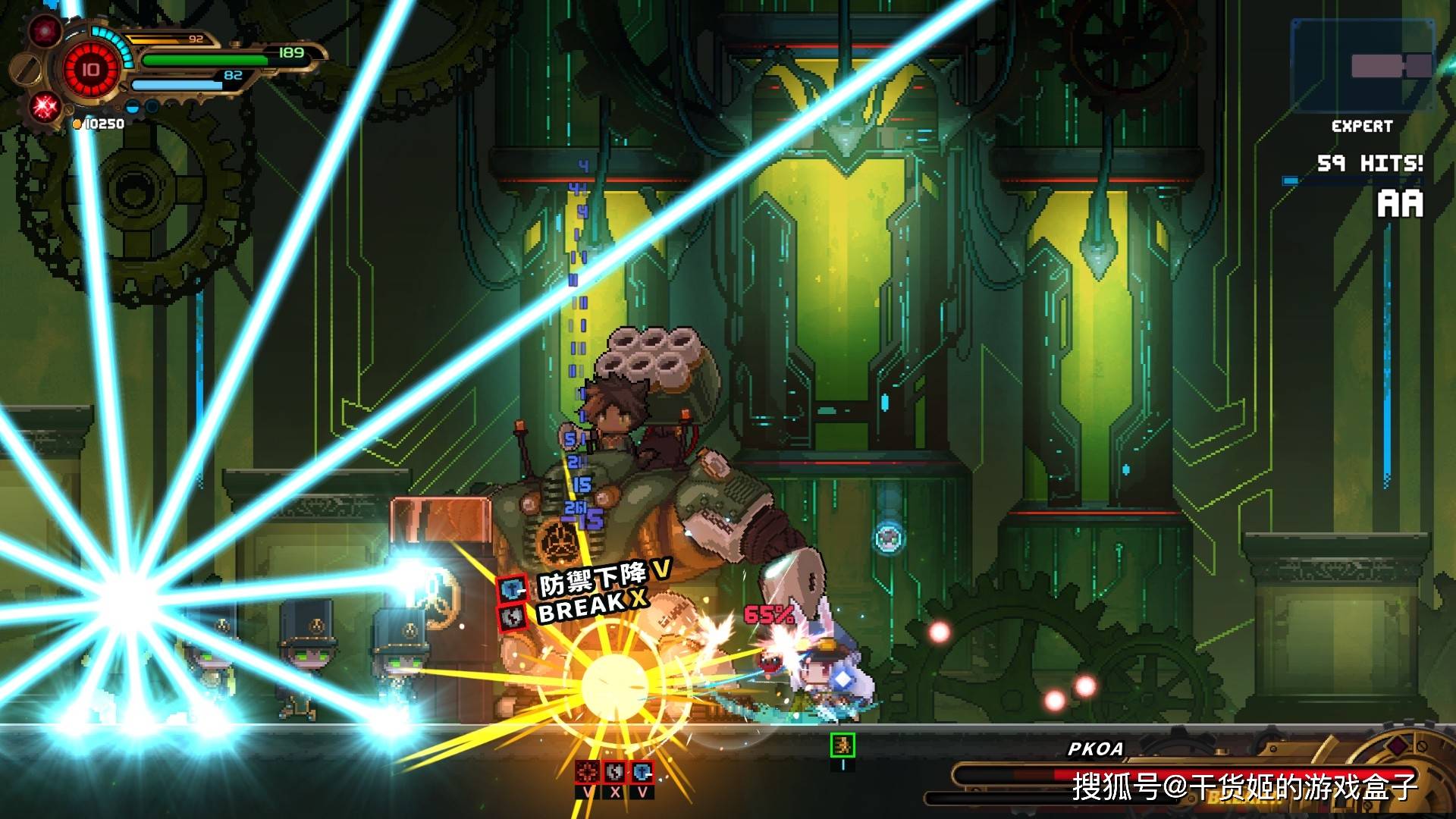 动作系统是本作最大的提升,帧率增高使得输入延迟减少,操作更加顺滑,角色像素模型动画的细致则带来了流畅华丽的动作。随着流程进行,玩家会逐渐解锁多样的攻击方式,高伤的连斩与高连击数的刺击各有侧重,蓄力扳手砸下时的特写与震响魄力十足,甚至有轻轻需要搓招的连击可以打出,新的动作机制如后跳闪避又提升行动力,让本作的动作表现兼具速度感与爽快感。