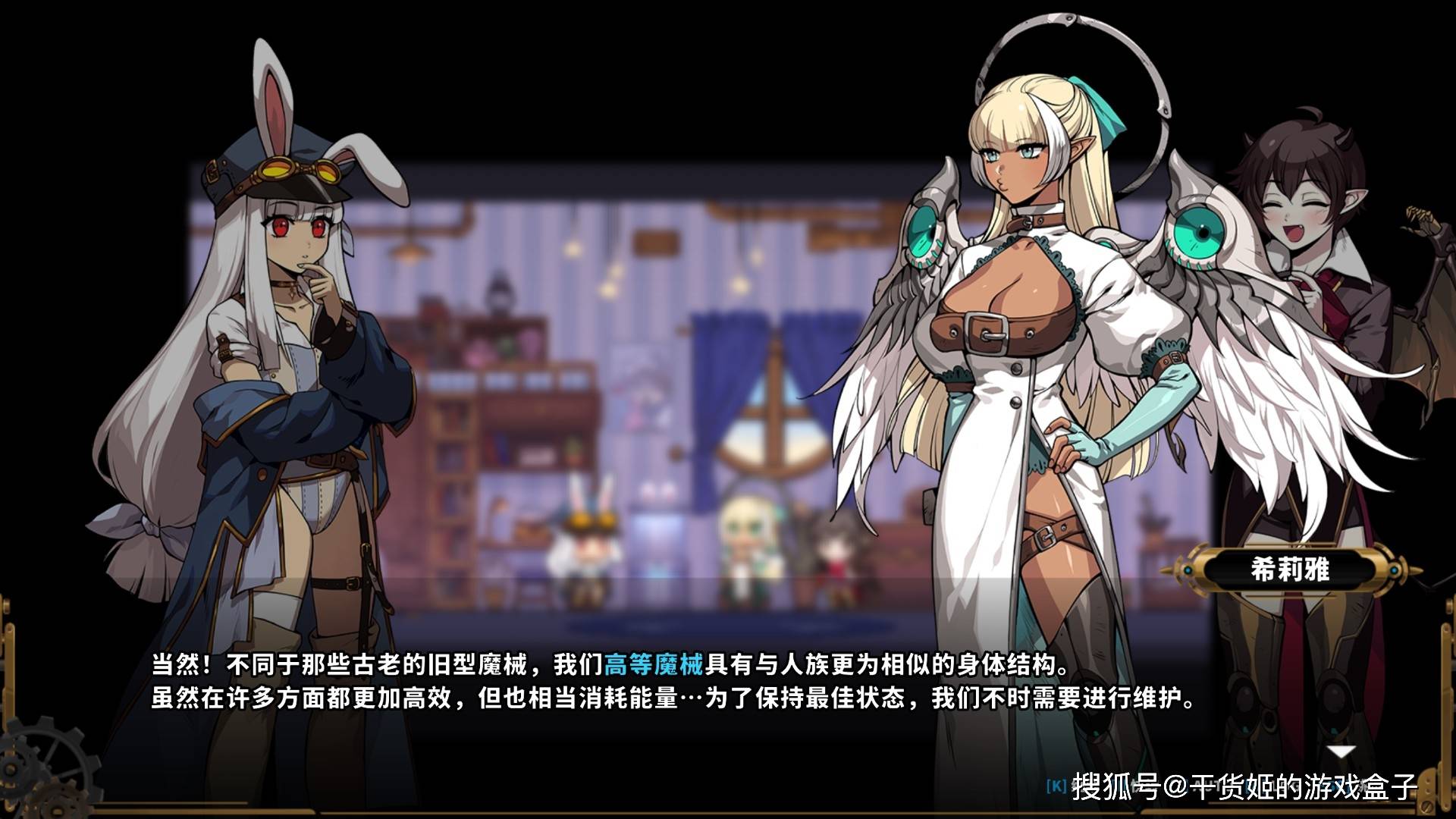这片场景下本作的故事讲述跟前作相同,采用adv式人物对话,辅以少量像素小人演出和cg插图。此外,全cv是重点,虽然提高了游戏的成本,但增幅了沉浸感和情绪渲染,是同类游戏里难出其二的体验。不同于前作的是,前作的剧情全是废萌,没有什么信息量,而本作则有着更详尽的世界观,兽耳组、魔械等设定契合视觉表现、填充了广大的世界。