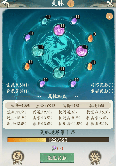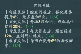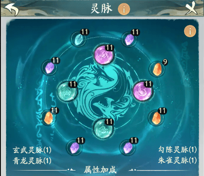 灵脉这个系统也是可以给道友提供大量的战斗属性加成的,这个系统的话基础属性加成不是很多,但是他的战斗属性增加的就非常的多了。而且是有一些提升的战斗属性或者是抗性加成的,增加也是非常的多只不过是有一些条件才可以触发这些效果的。灵脉系统里面的灵脉是分几种的。位于中间的四个位置的灵脉分别是,青龙丶玄武丶勾陈和朱雀这四个灵脉的,他们是属于神兽灵脉。就是这些灵脉会增加一些提升的战斗属性加成。就是在战斗中触发一些战斗属性之后会增加概率或者是每回合之后增加触发这个效果的概率的灵脉。其他的灵脉就是外圈的灵脉了。每个灵脉都是有对应的位置的,像什么坤位这种,而且你后面激发的灵脉只要是有带同样位置的灵脉只能替换同位置的灵脉不能替换到其他位置。外圈的灵脉就只增加战斗属性和战斗抗性不会想神兽灵脉哪样增加其他的属性。