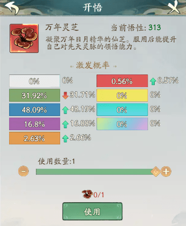 前面我们说的是要想提升激发里面的品质就只能在灵脉开悟里面提升的,现在我们来说说开悟这个系统,灵脉激发的概率是通过你当前的悟性来增加激发更高品质灵脉概率。悟性的提升就需要大量的万年灵芝这个道具来提升,这个道具的话是和灵草一个地方可以获得的,就是镇妖塔这个玩法里面就可以获得大量的万年灵芝,每次提升都是会增加更高品质的灵脉激发概率的,同时也会减伤低级灵脉激发的概率的,每次消耗一颗万年灵芝就会提升一点的悟性。悟性越高激发高品质灵脉打概率就会越来越高的,只不过还是随机的而已,虽然概率高了也要看一些运气的。