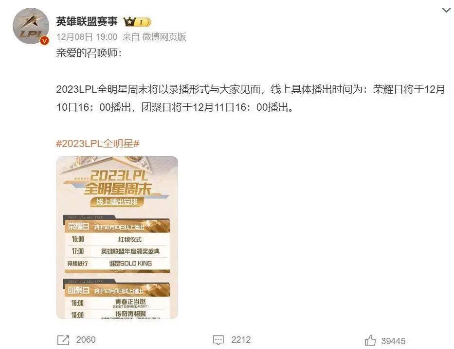 LPL今年的全明星原计划是在今天晚上开始,进行一系列的比赛与颁奖,结果在昨天晚上的时候,英雄联盟赛事官方突然发布消息,全明星直播取消,将会以录播的方式供大家观看,录播播出的时间是10日和11日下午四点。