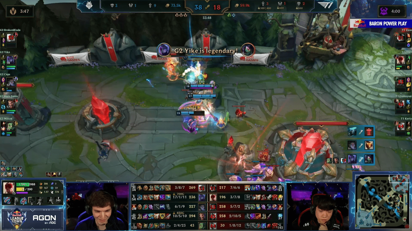 欧洲表演赛的最后一场比赛就是欧洲王G2对战全球总决赛冠军T1。这场比赛T1可以不受全局BP的限制,选择任何英雄。虽然这几年在世界赛上颗粒无收,但G2作为欧洲历史上夺冠LEC次数最多的冠军队伍,也是欧洲最强的王牌了。
