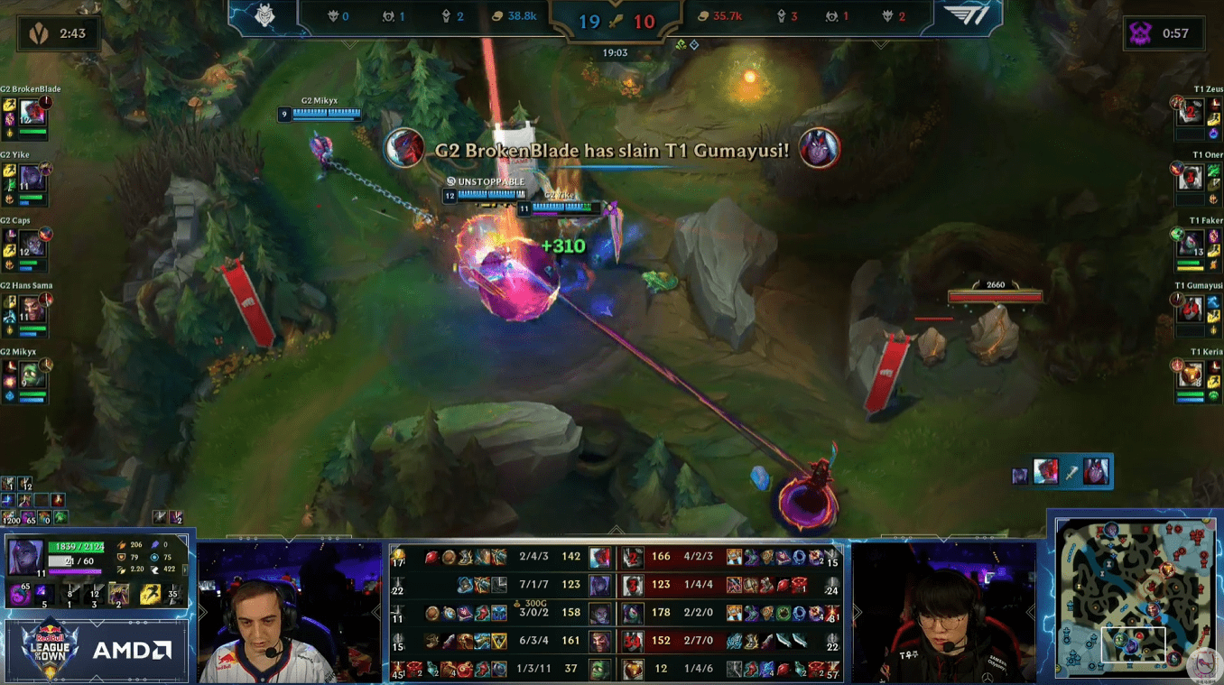 这场比赛基本上就是没什么娱乐水分了,两队都拿出了自己选手很擅长的英雄。尤其是G2的下路Hanssama很擅长德莱文,甚至可以说是欧洲第一德莱文了。打野也是他最喜欢的英雄虚空女皇,上单BB的永恩在欧洲也是招牌。T1同样不差,打野冠军皮肤选择的盲僧,上中下几乎都是绝活英雄。