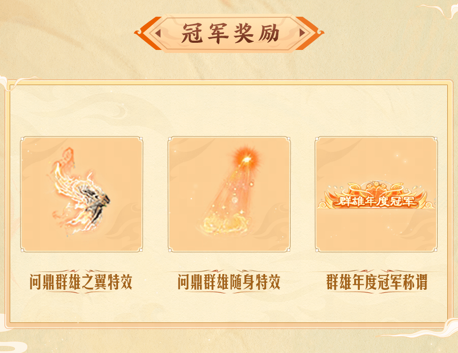 群雄逐鹿争霸赛年度总决赛的冠军队伍,将获得问鼎群雄之翼翅膀特效、问鼎群雄随身特效、群雄逐鹿·年度冠军称谓等奖励和荣誉!