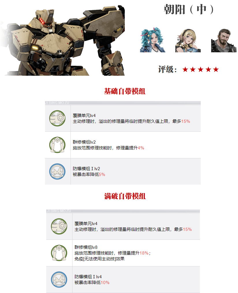 接着第四个是朝阳,最强的奶妈S机兵,维一的评级为★★★★★,官方定义中是赛文的专属机兵,其最大的特点是可以将溢出的奶量转化为提升机兵的血量上限,这个效果几乎就可以等同于提升我们的生存上限,和一般的奶妈根本不在一个维度了,所以不管怎么讲朝阳都算是综合效果最好的一个奶妈机兵。