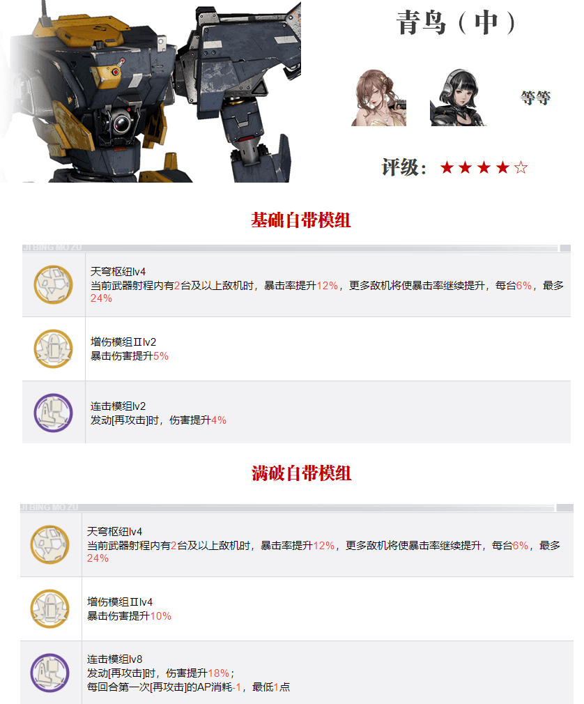 第五个机兵为青鸟,一个更加适合狙击手的S机兵,评级为★★★★☆,其最大的特点是射程范围内敌方数量越多,则暴击率越高,所以要做大敌方数量越多则我方的射程越大越好,这点就非常适配狙击手了,而且还更加适配娜塔莉亚,因为: