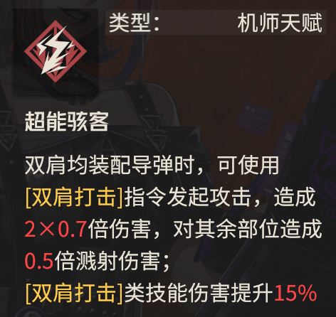 第三个机兵为狼獾,是一个更加适合战术家的S机兵,维一的评级为★★★★,其最大的特点就是范围攻击时若目标≤2个,伤害会有25%提升,25%的伤害提升啊!!!我勒个去,真高!但这个东西却有点矛盾,因为我们使用范围攻击时,例如电磁炮/火箭等,我们的预期应该是打的敌人越多,收益就越高,而这个狼獾却把人数限制到了2人以下才有增伤,所以这点就有一丢丢的反人性,虽然说不是不能触发,但维一总总觉得有点别扭......这也是我给4星的最大原因。