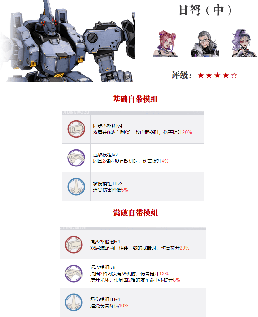 今天最后一个讲到的机兵就是人手一只的日弩了!评级为★★★★☆,奈奥米的专属机兵,游戏中超过99%的朋友都会把奈奥米与日弩结合在一起,不光光是因为在官方故事中奈奥米的专属机兵便是日弩,更重要的是日弩的特性:双肩装配两门“种类”一致的武器时,伤害提升20%,这点简直就是为了奈奥米量身定做的......一般。具体原因如下图所示,维一就不多做解释了。