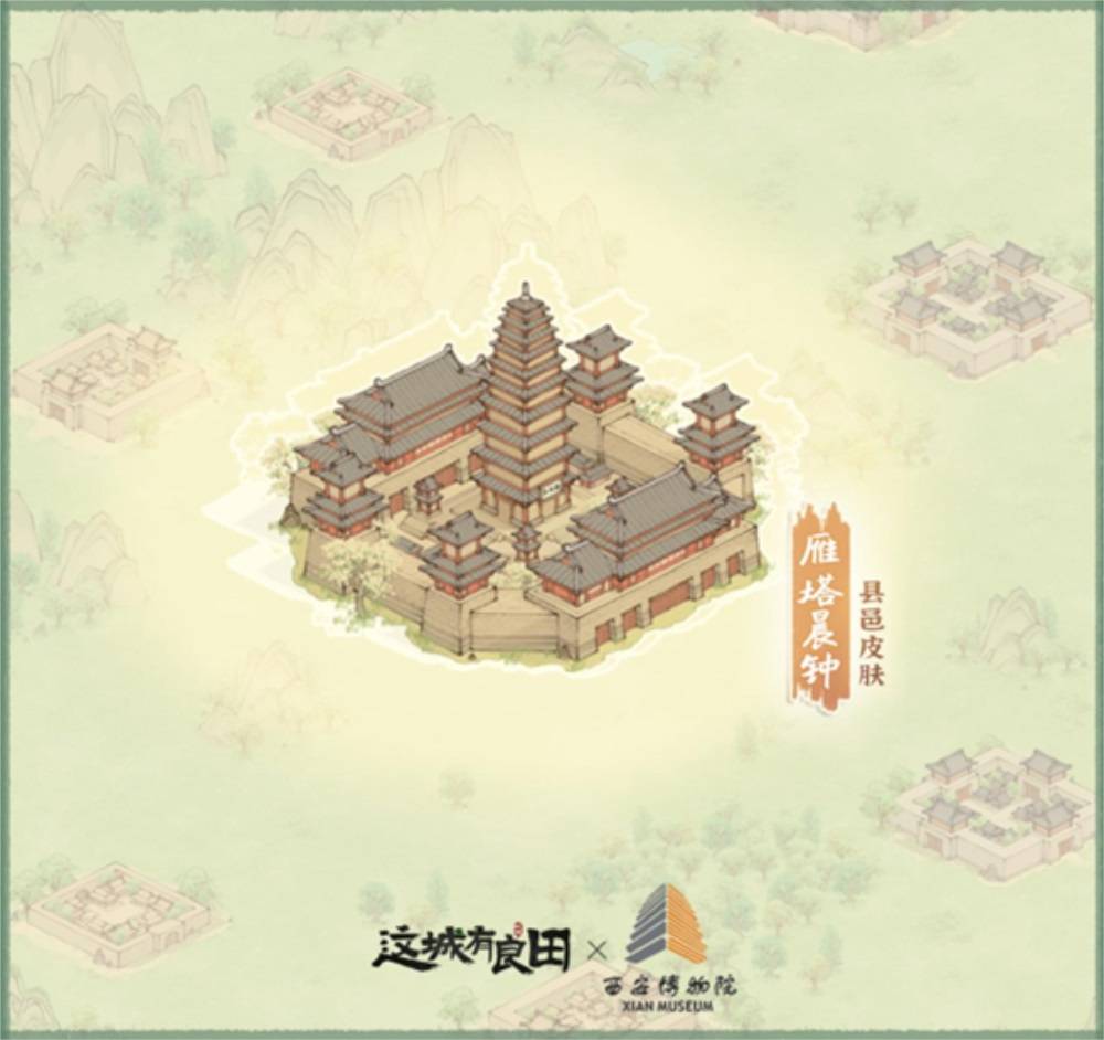 在与西安博物院文创部负责人祁晓东先生的深入交流中,《这城有良田》制作组以世界文化遗产、关中八景之一“雁塔晨钟”所在地荐福寺小雁塔、珍贵馆藏文物堕马髻仕女俑、三彩凤首壶、金背瑞兽葡萄镜等珍藏文物为艺术灵感,设计了一系列文物主题外观皮肤与联动玩法——