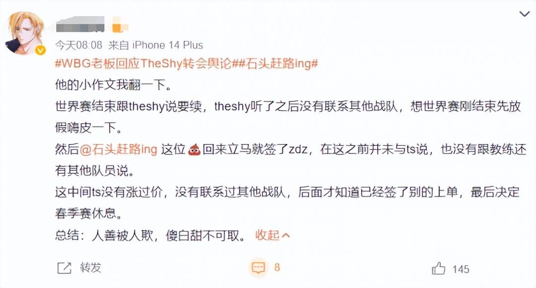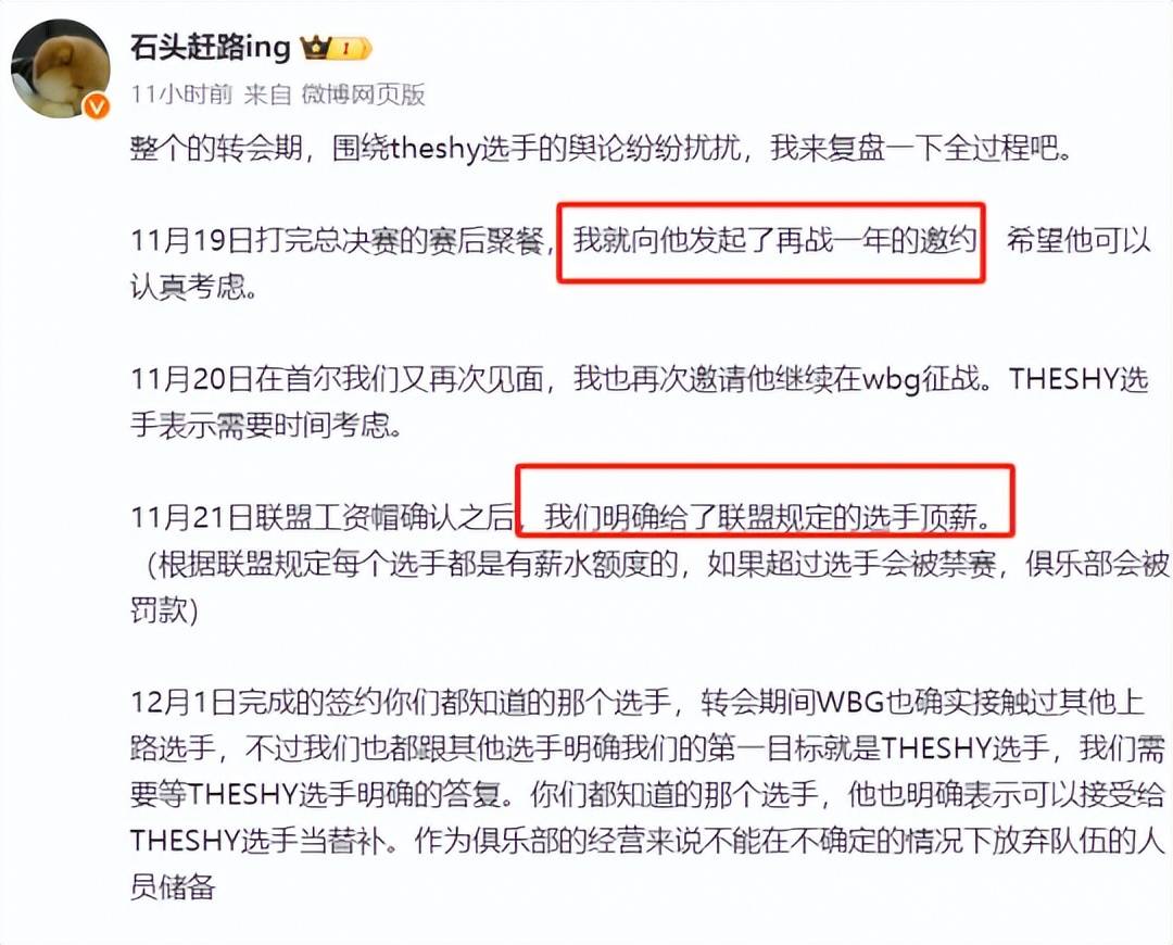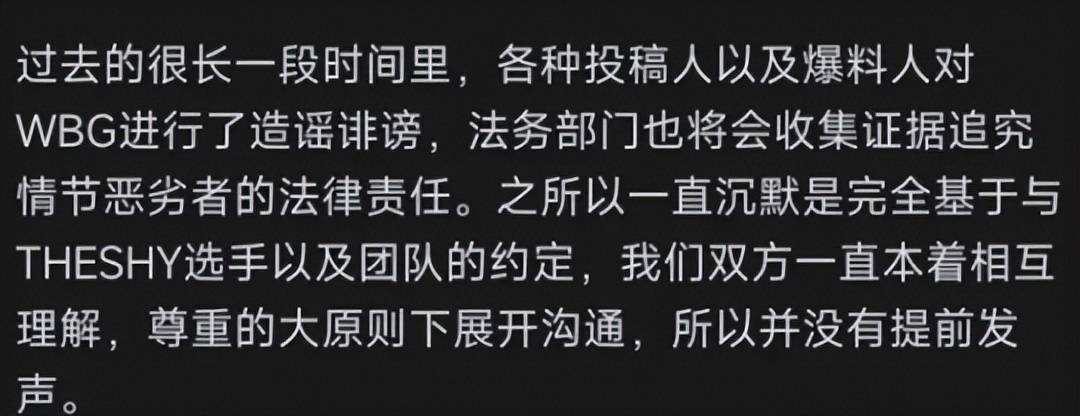 对于各种猜测,WBG老板也立马发文说明一切,The Shy成为自由人的原因大部分都出在选手自己身上,他在打完全球总决赛就邀请The Shy再战一年,并给到了他联盟顶薪的待遇,不存在网上说的压选手身价情况。另外,他们之所以签下ZDZ也是因为The Shy一直不给明确答复,俱乐部出于搭阵容的考虑先定一个备选,且ZDZ本人已经答应了给The Shy打替补。