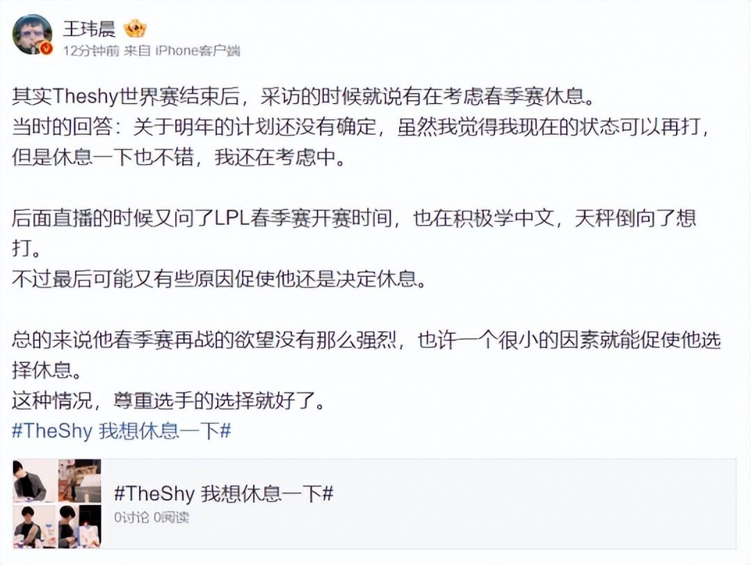LPL冬季转会期已经结束了,各大俱乐部的人员名单也基本确定,当大家都在讨论时,却有一名上单选手宣布不打了?在12月11日晚上11点55分,The Shy一封来自韩国的道歉信,宣告他已经回到了韩国,准备在春季赛休息一阵子,消息传出后引起了全网的热议....