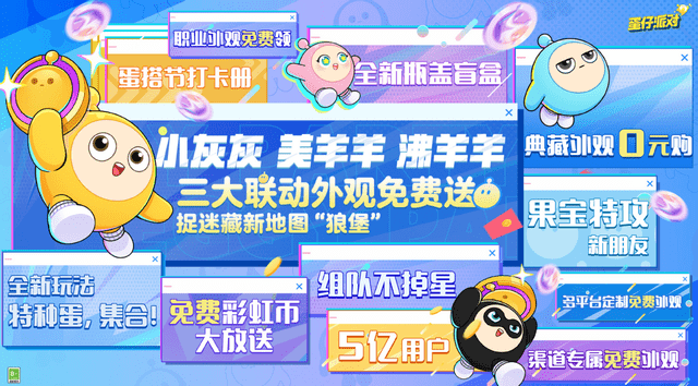 在「蛋搭节」首周“欢蛋周“中,游戏内将迎来「喜羊羊与灰太狼」的三大新联动外观,包括美羊羊、沸羊羊、小灰灰,这些外观都将免费送给玩家。此外,典藏外观、平台定制外观、渠道专属外观、彩虹币雨、瓶盖盲盒等免费福利也将在「蛋仔岛」中悉数涌现,为用户提供极致的游戏体验。