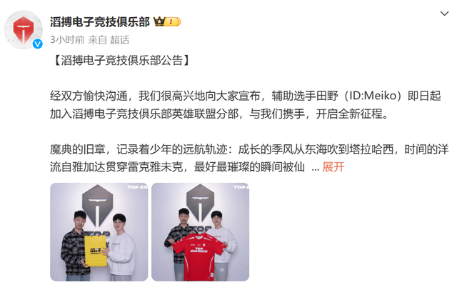 在转会期临近尾声之际,知名爆料人涵艺爆料Meiko可能加入TES的消息后,这件事就成为了转会期LPL讨论度最高的话题。而随着转会期结束,TES也是终于在今日官宣了Meiko加入。从官博晒出的照片可以看到,TES经理皓哥也是嘴角上扬忍不住脸上的笑意,可见确实为队伍引入强援感到十分开心。