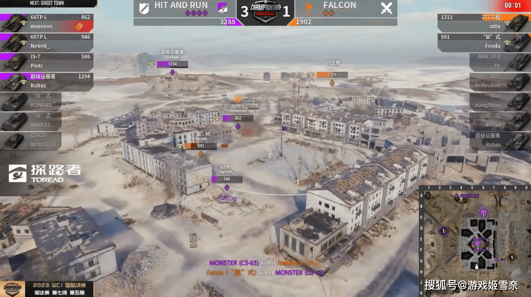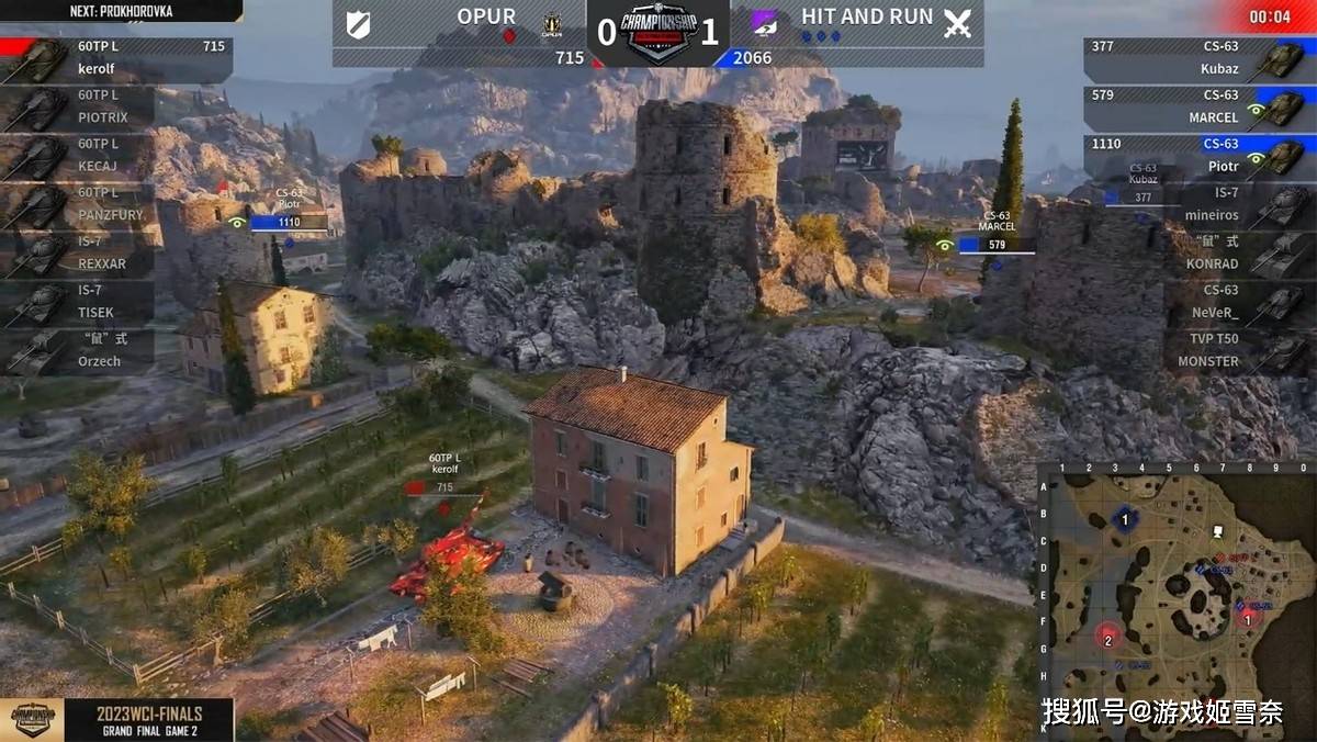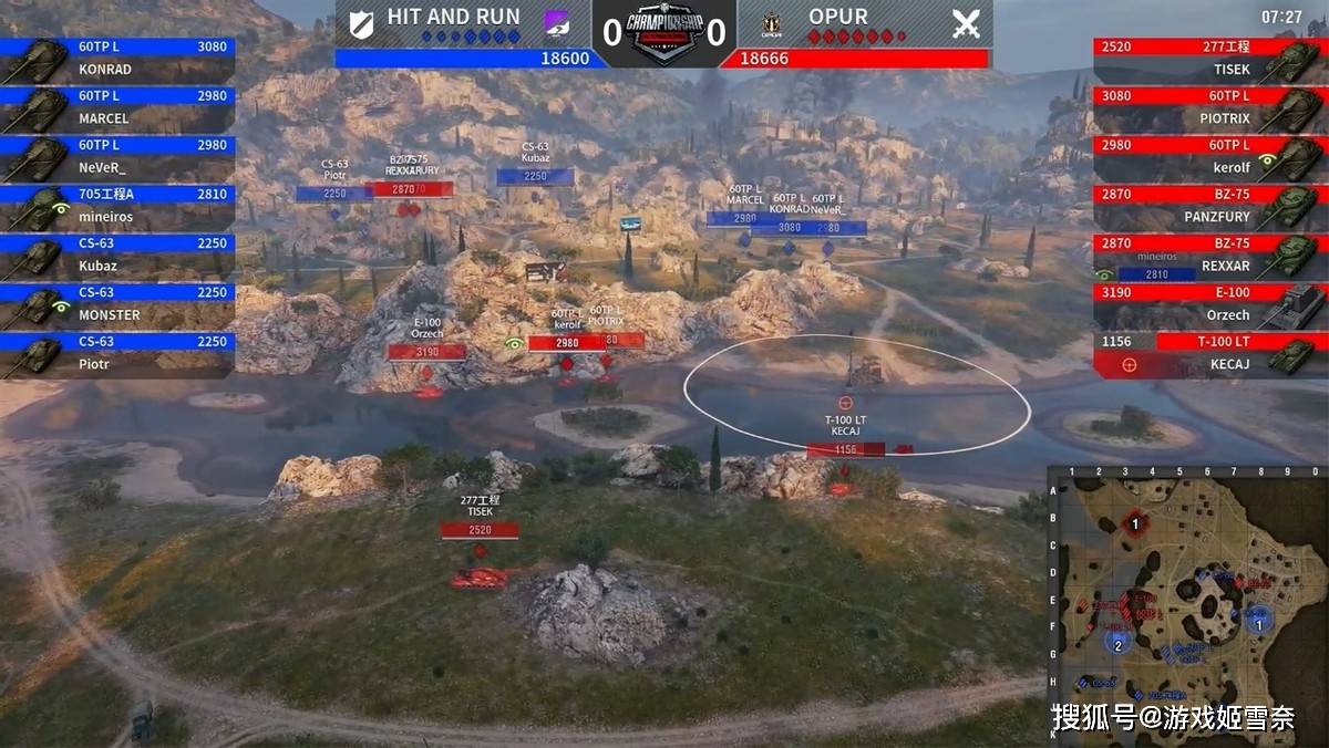 第二张地图【普罗霍洛夫卡】中,HIT AND RUN看破OPUR战术,当OPUR选出T-100LT配双Strv 103b的阵容时,果断决定让IS-7从5线中央强行翻越,通过快速分割战场导致OPUR被逐个击破。换边后HIT AND RUN准备故技重施想要再度分割战场,然而在防守方决定CS-63配合IS-7准备强行冲击1线公路时,却正中对手下怀遭遇埋伏,比分来到2:2。