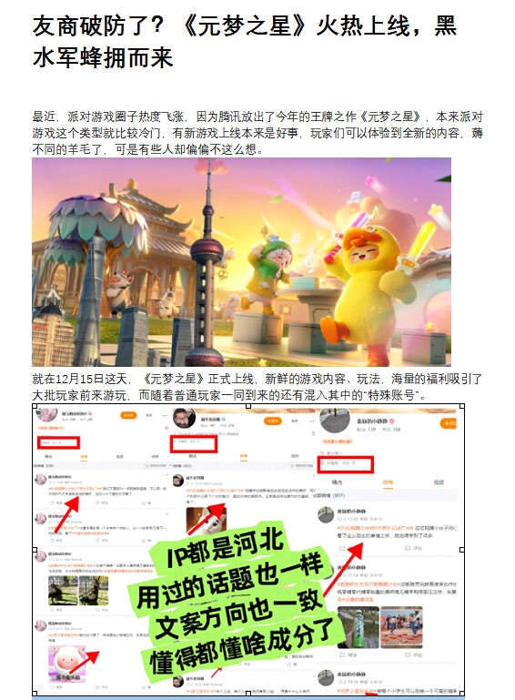 这些发布抹黑言论的账号存在同一ID、同一IP地址的情况,显然是被人雇佣的水军,这种低级操作让人不禁怀疑,这些水军到底是友商雇佣来抹黑《元梦之星》的,还是只是为了博取关注而散布不实言论。