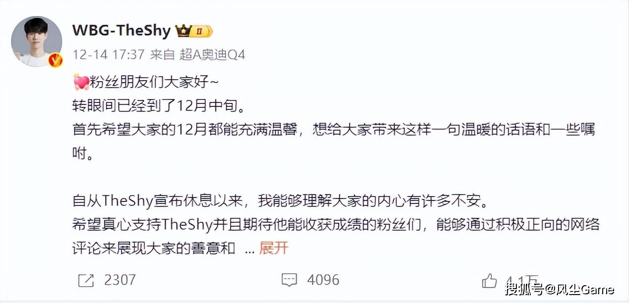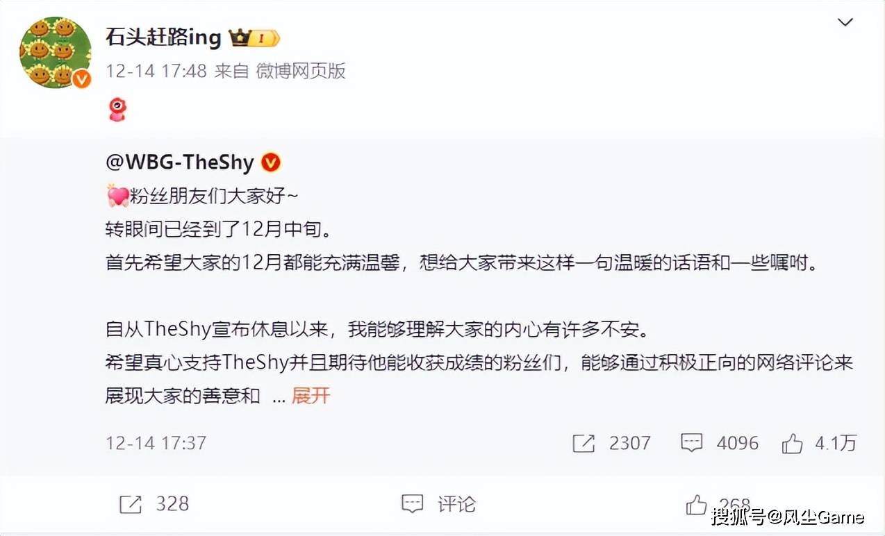 WBG官博评论区、超话,甚至是老板个人账号,从TheShy宣布休赛那一刻开始,就遭受了铺天盖地的谩骂和攻击,扛不住压力的石头老板,多次深夜发文,解释TheShy转会期的诸多问题,但被网暴的局面依旧没有改变,无奈之下,只能让TheShy团队发文喊话粉丝消停。