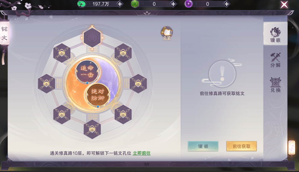 铭文镶嵌是一项重要的玩法,在八卦阵中,每个阵眼都有三个孔位可以进行铭文镶嵌。铭文可以根据指定的类型进行镶嵌,每个阵眼中,同一类铭文最多只能镶嵌三个。