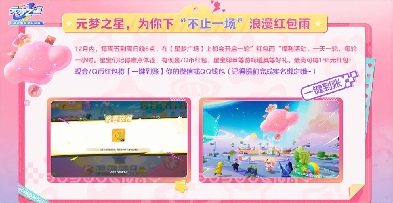 除了丰富的时装皮肤福利外,这次天美还特意为大家准备了红包福利,12月内每周五到周日晚上8点,在星梦广场上都会开启一轮红包雨福利活动,据说最高可得188元红包!这种泼天的富贵有一天居然真能落到自己头上,你敢相信吗?