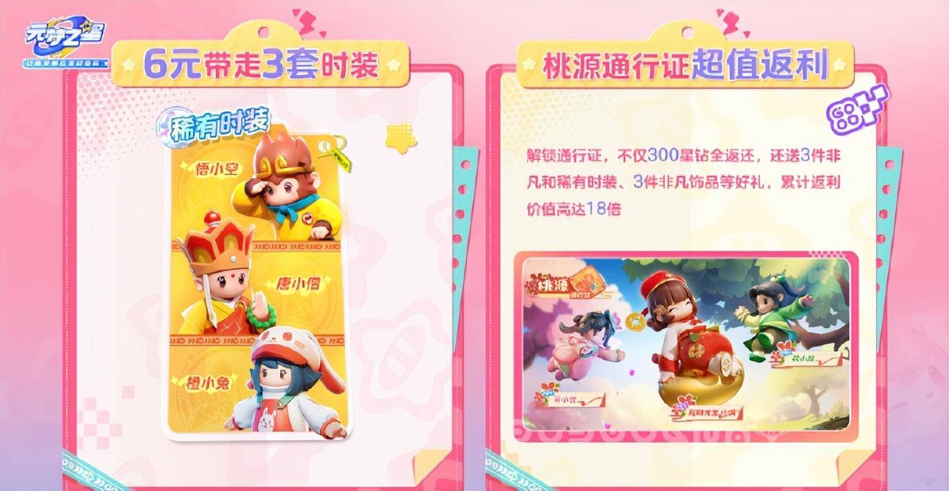 并且这次元梦之星还推出了桃源通行证超值返利!据说解锁通行证,不仅300星钻全返还,还送3件高品质时装等好礼,累计返利价值高达18倍!至于是哪3件高品质时装,就需要各位网友自行去解锁了,总之肯定不会让各位失望,毕竟天美的美工属于业内顶尖。
