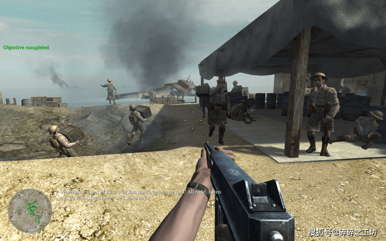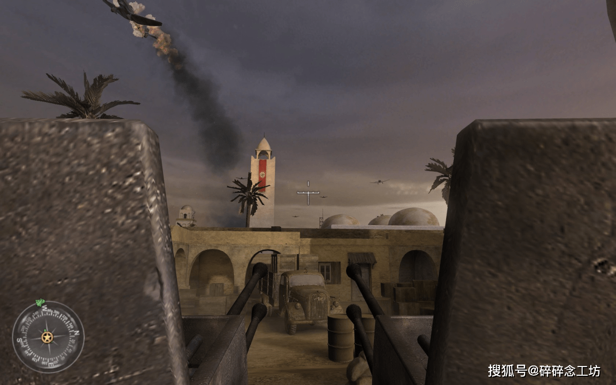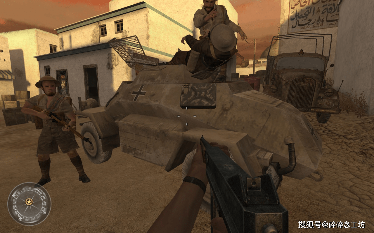 英军战役从北非战场第二次阿拉曼战役开始,1942年10月29日,玩家扮演的约翰戴维斯中士(John Davis),隶属于英军第7装甲师,奉命摧毁德军补给站并获取重要情报,而负责带队的正是我们的老熟人普莱斯上尉,约翰在这位经验丰富的老兵带领下顺利完成任务。紧接着马不停蹄被派往阿拉曼南部一个小镇,这里正遭到德军围攻急需增援,约翰先后使用88战防炮和MG42机枪,击退了多个方向来袭的敌人,最后登上顶楼用无线电指挥后方炮兵,消灭德军多辆坦克后成功守住小镇。