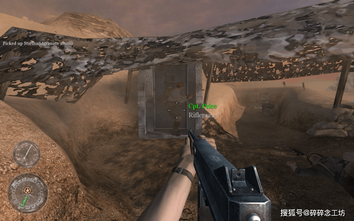 《使命召唤2》中英军战役部分,可以说是这一代最精彩的内容,不仅有巷战、野外、载具等多种类型丰富的内容,更重要的是上一代中人气极高的NPC普莱斯上尉继续登场。关于COD前两代中普莱斯是否是同一人,动视并没有给出官方设定,也没有明确表示2代情节是1代续作,而且1代中普莱斯身份是SAS指挥官专门执行各种机密任务,2代中则成了第7装甲师一员,这也使其身份产生争议。但是两部游戏中普莱斯造型一致,配音也都是英国演员迈克尔高夫(Michael Gough),任务时间线也不冲突,尽管有不严谨之处,但玩家一般认为是同一人,估计动视当年也没有过多考虑整个系列的世界观,这是后话。