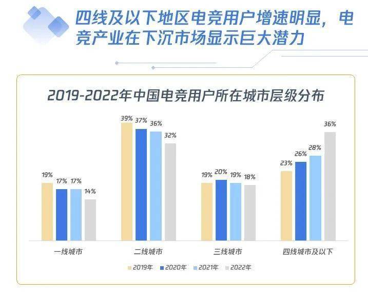 根据腾讯电竞、企鹅有调、亚洲电子体育联合会联合发布的《2022年亚洲电竞运动行业发展报告》,2022年,四线及以下城市电竞用户比例达到了36%,首次超过了二线城市,跃居第一。这意味着,在未来,以小城市和乡村为代表的四线城市将成为电竞用户的主力军。