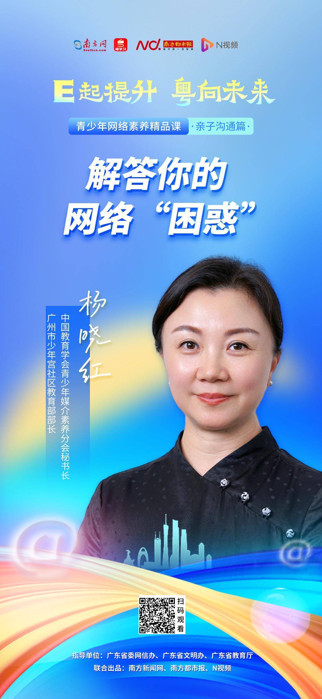 在“E起提升 粤向未来”青少年网络素养精品课程第4集《解答你的网络“困惑”》中,中国教育学会青少年媒介素养分会秘书长、广州市少年宫社区教育部部长杨晓红分享了未成年人用网相关调研成果,并围绕亲子家庭共同面临的“网络沉迷如何是好”“网络暴力如何避免”等用网问题进行探讨,介绍“制定亲子约定”等解决方法,并倡导全民共同提升网络素养,共建网络清朗空间。