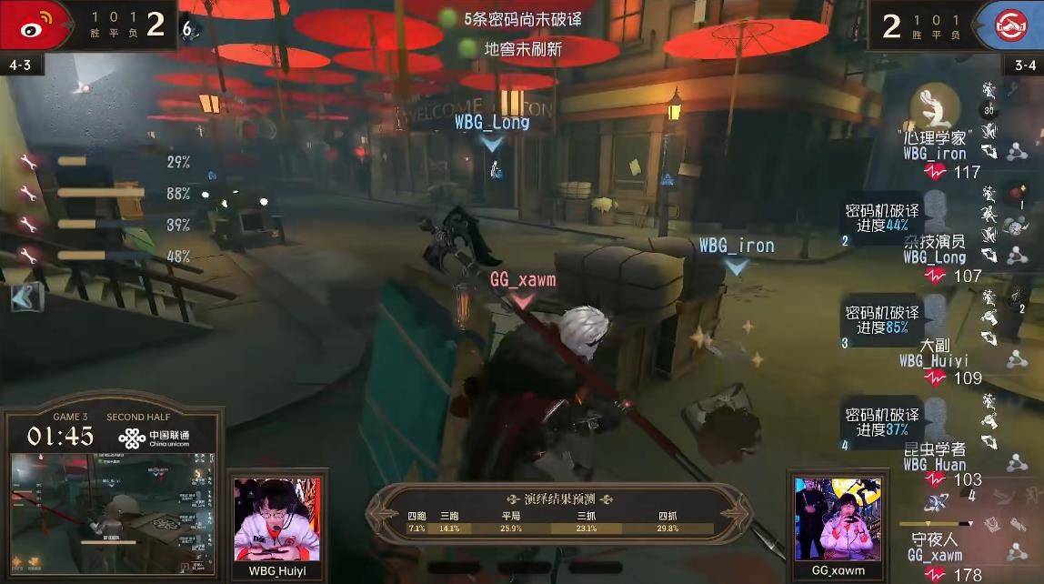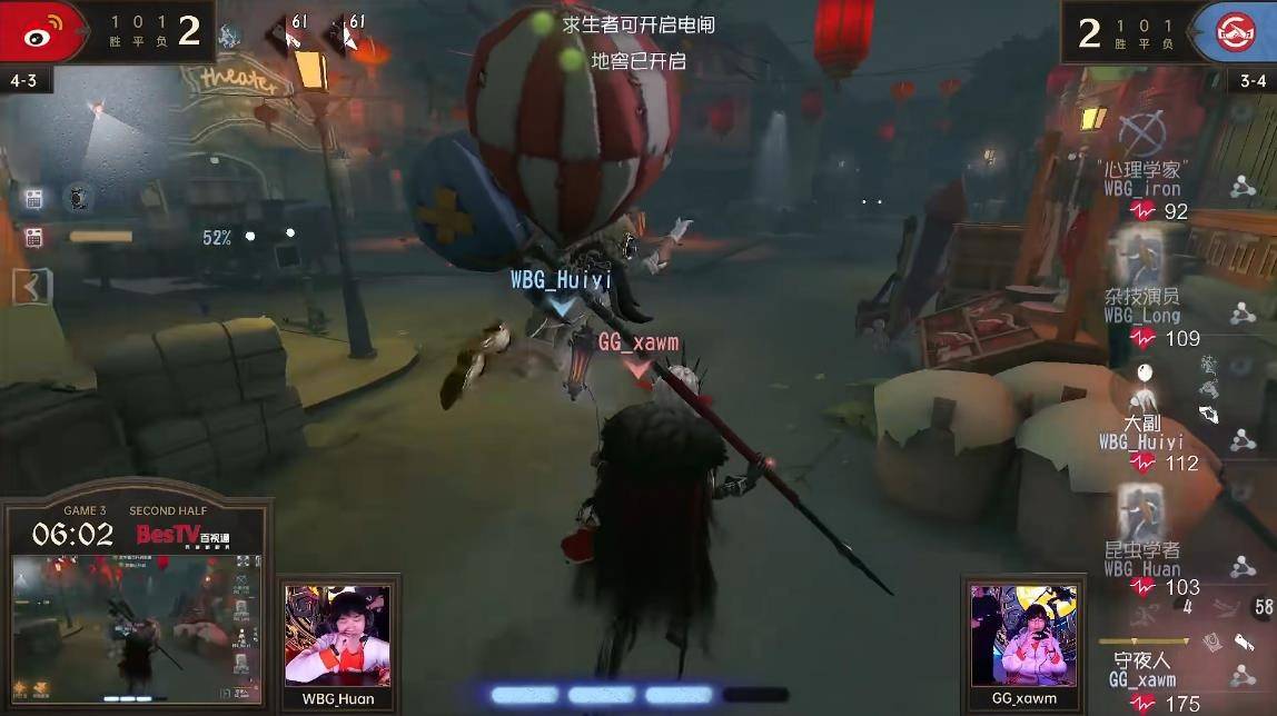第二局比赛WBG战队以7:2的优势领先成都GG战队,第三局比赛地图为唐人街,这张地图是求生者偏优势图。