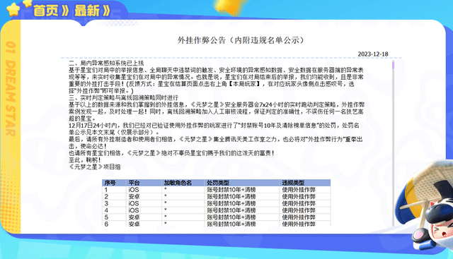 但与此同时,也引来了一些不守规矩的玩家,他们使用外挂扰乱游戏的公平对局,这也是所有游戏都会面临的问题,特别是热度高的。好在对此《元梦之星》的官方也没有懈怠,在上线的第三天,官方就发布了打击外挂的公告,封禁的账号达800多个,处罚力度更是“封禁账号10年及清除榜单信息”的程度,不难看出官方整治外挂的决心。