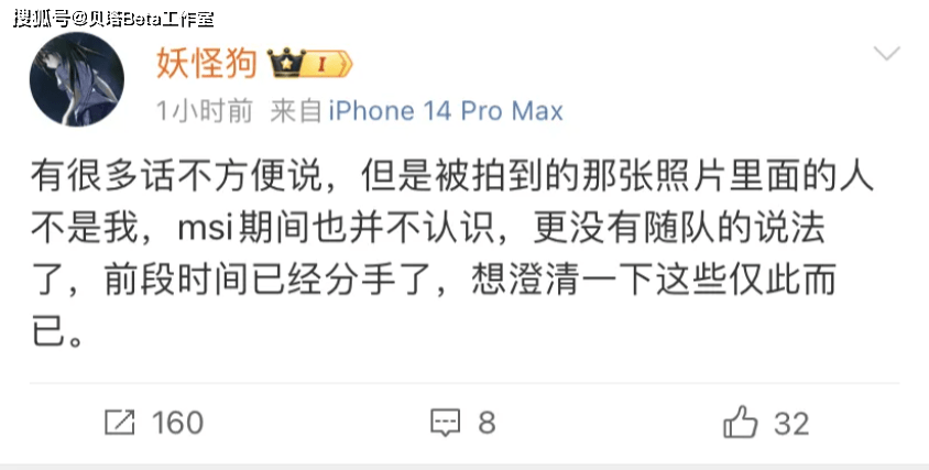 结果前女友亲自发微博辟谣了,表示照片里被拍到的人并不是自己,自己没有在MSI期间随队去比赛现场,前段时间已经和Bin分手了。