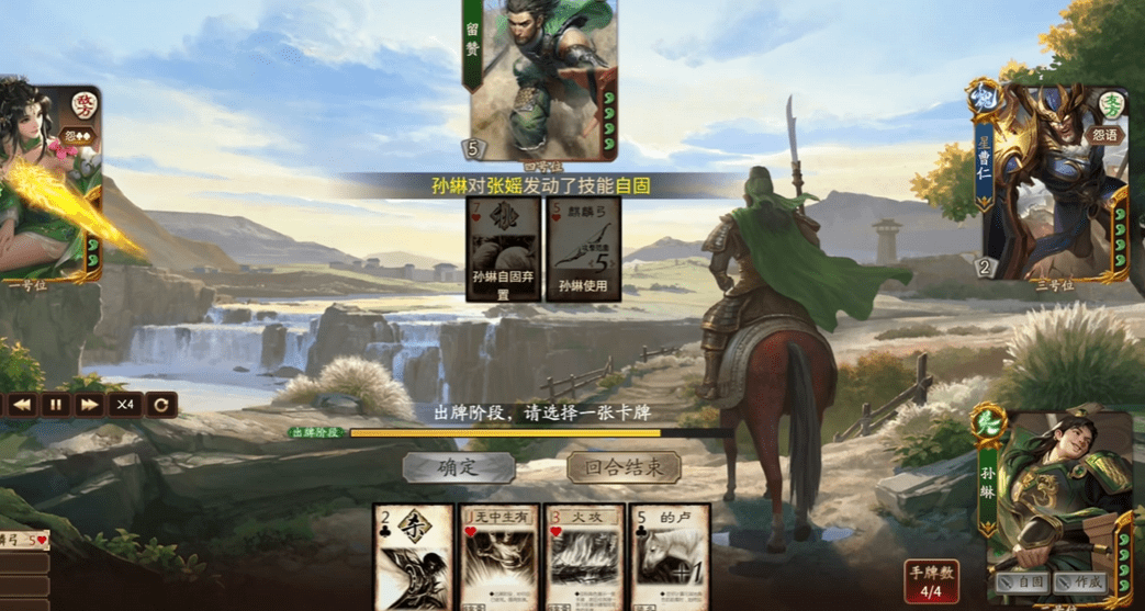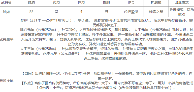 孙綝是4血2技能吴将,【自固】出牌阶段限一次,你可以弃置1张牌,然后获得场上一张装备牌。若你没有因此获得其他角色的牌,你摸一张牌。 【作威】当你于回合内使用牌时,若你当前手牌数:大于x,可令此牌不可响应;等于x,可对一名其他角色造成1点伤害;小于x,可摸2张牌然后本回合此选项失效(x为你装备区的牌数量且至少为1)。