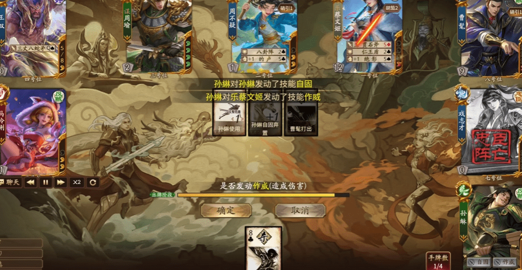 能看出孙綝整体上是与秦朗的操作模式类似,都是要熟练知道能触发什么效果,【自固】的技能比较简单,抢装备与配合【作威】用的,可惜抢来的只能自己用不能给别人,要不然强度还能进一个档次;主要看的是【作威】,用好【作威】需要时刻留意自己的装备数与变化,如果装备仅仅是固定数那操作难度就没多少,因此额外收益是大头是“等于”,小头是“小于”,这个用好了就是留赞的直伤,也就是说要先会玩沙摩柯才能玩好孙綝。“大于”这个效果是给有了AK之类的不变成白板兜底的,也就是有了AK摸了牌能变“白马”。“小于”和【自固】配合直接变成了一个吕范;不过要注意的是触发“小于”的失效是一定要用牌的,换句话说除非是场面上有“置换”装备的将存在,否则用第一张牌是X不是2就永远摸不了了。