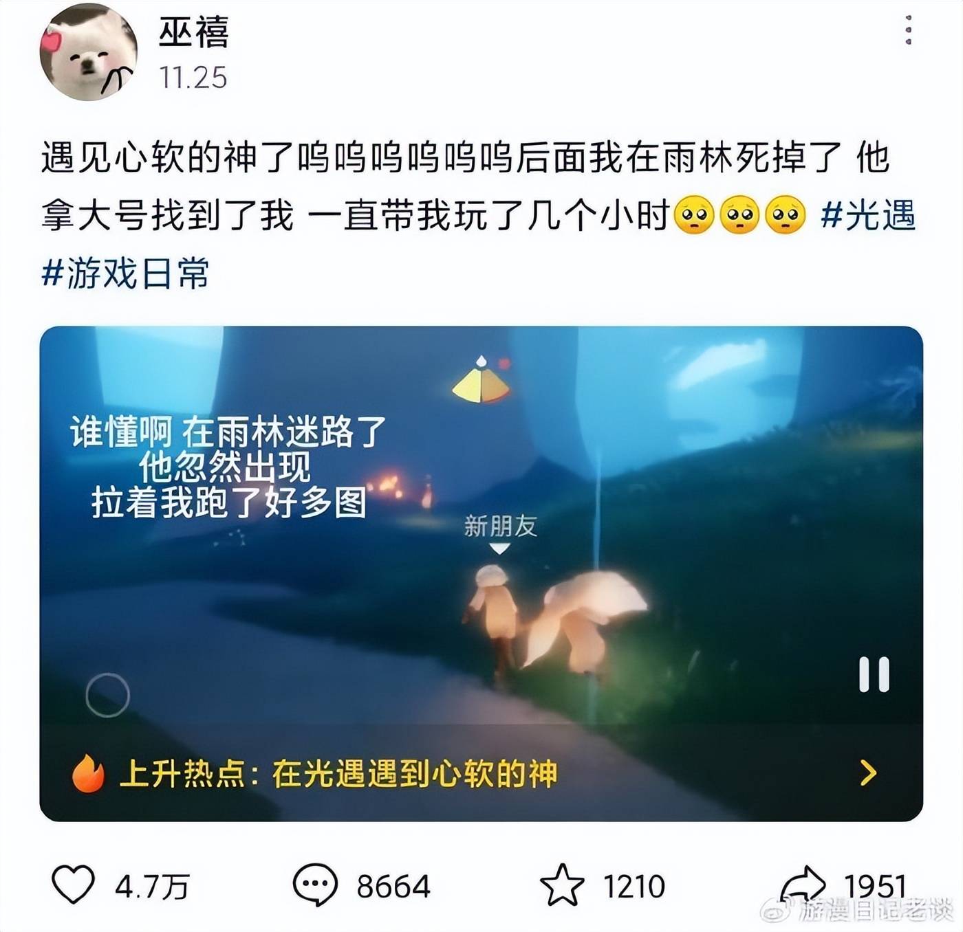 蛋仔玩家们在游戏时闹出了不少笑话,比如把热心指导自己的《光·遇》玩家误认为是游戏NPC、将《光·遇》的NPC“先祖”重新命名了等。对此,《光·遇》玩家也只是温柔一笑,反而更用心地鼓励起蛋仔玩家们。这些热情的夸奖让蛋仔玩家们感动不已,纷纷在网上刷起了#在光遇遇到了心软的神#、、#光遇玩家能把我钓成翘嘴#、#我的光遇蛋搭子#等词条,并分享自己和《光·遇》玩家的温情瞬间。