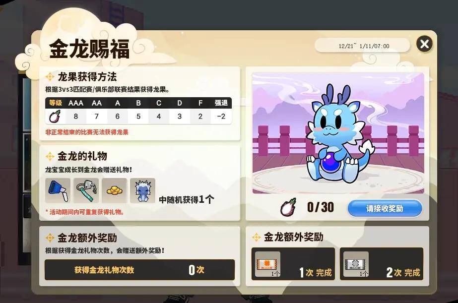 活动规则:根据匹配赛/俱乐部联赛的结算结果获得“龙果”。龙宝宝成长到金龙会赠送礼物。