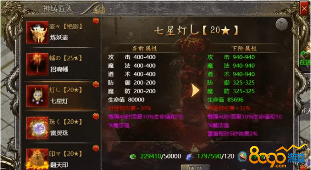 属性增益与特殊效果: 升级七星灯后,玩家会获得各种属性增益,包括但不限于攻击、防御、魔法、道术、魔法防御和生命值。此外,七星灯还具有特殊效果,比如定时回复生命值和魔法值,以及提供雷盾效果,每隔一定时间回复生命值。这些效果能够显著提升玩家在战斗中的持续能力和生存能力。