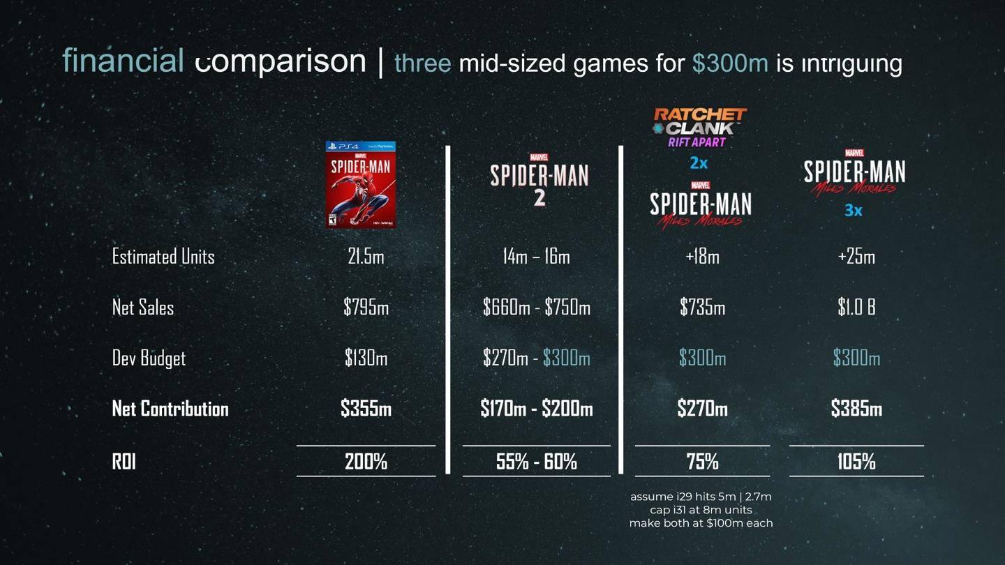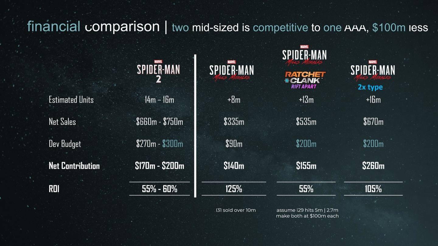 据悉,“失眠组”在泄露的 PPT 中声称自家“中型游戏”《蜘蛛侠:迈尔斯・莫拉莱斯》预算只有“大型 3A 项目的三分之一,但收入却十分可观”。