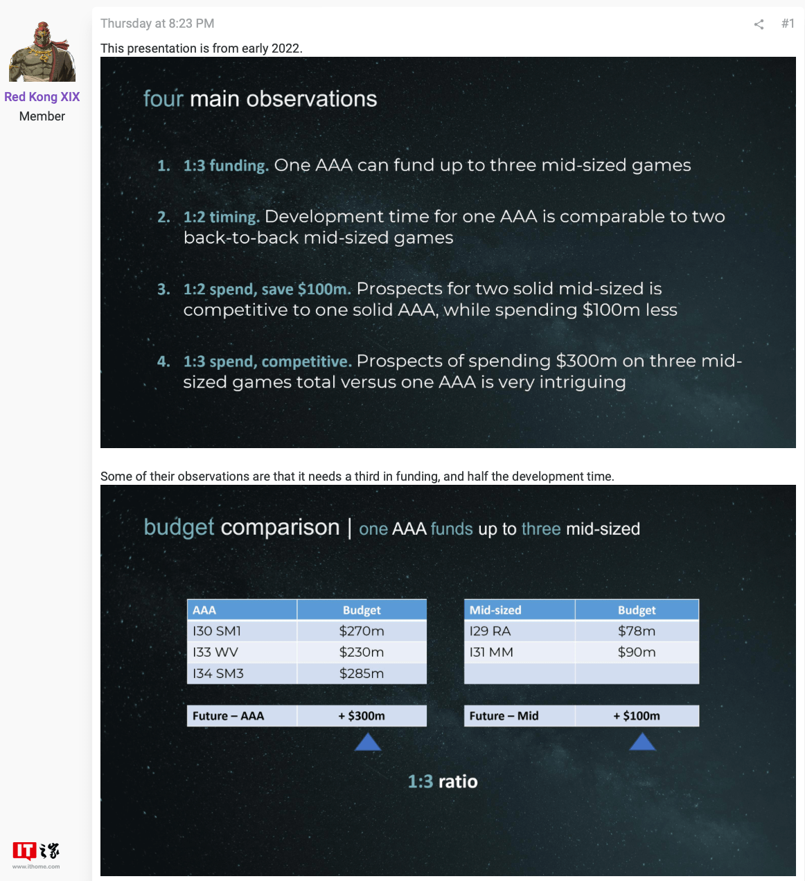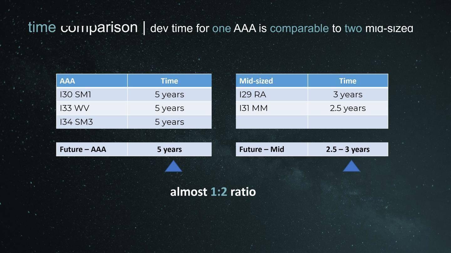“失眠组”同时援引数据声称,在其他厂商在制作 3A 大作的时间内,工作室能连续打造两款类似规模的“中型游戏”,从而填补其他厂商的制作周期空洞,并带来更多“丰厚的收入”。