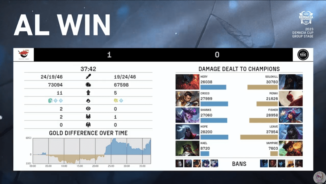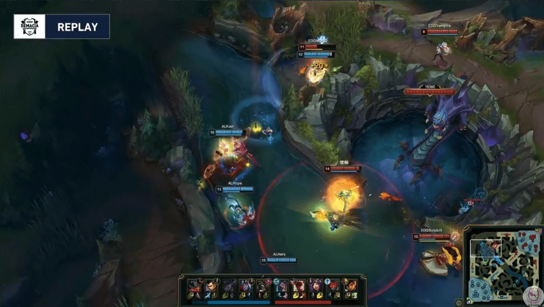 前期还是有来有回,甚至凭借上单乌迪尔的表现有优势,但是打大龙ADC脱节撤退不及时直接被秒,然后中单妮蔻莫名其妙在队友死了之后冲到别人脸上放了个空大阵亡,结果被AL反拿下了大龙。