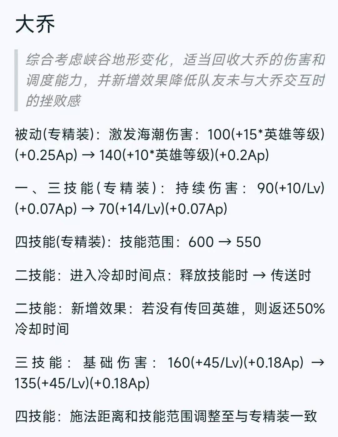 前段时间上线的专精装的大乔,可谓是把大乔拉升到了一个全新的高度。而现在,又对她进行了一波较大的改动,不仅仅是针对专精装,对于不出专精装的大乔而言,也是加强。