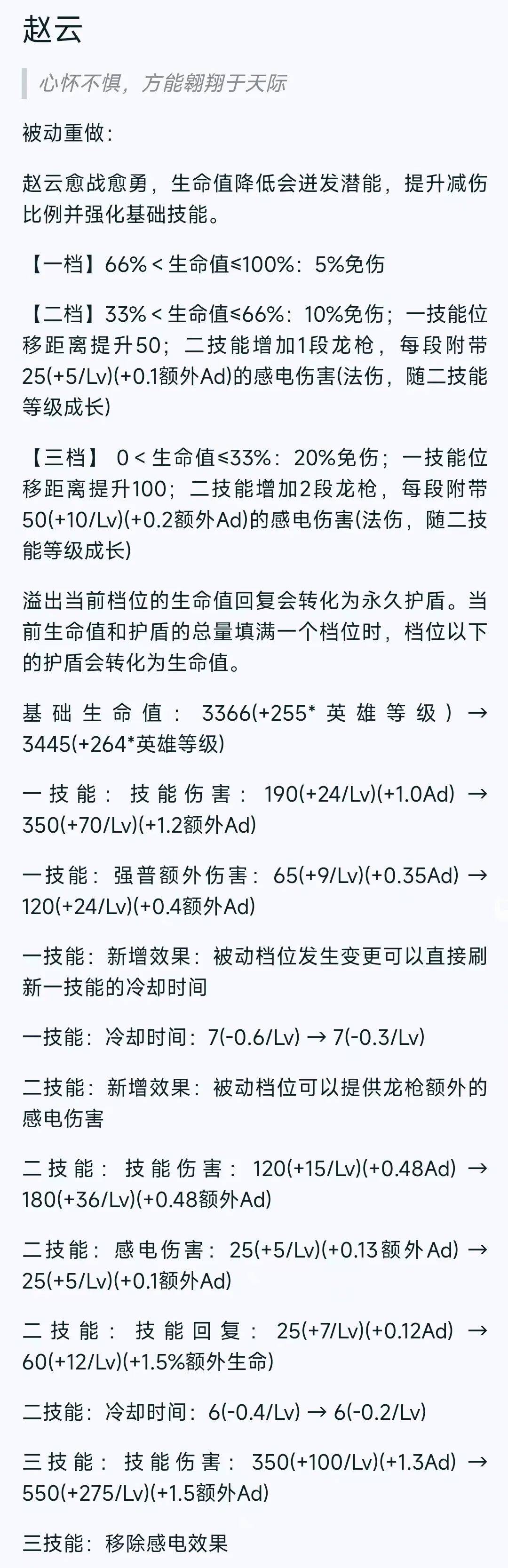 之前体验服测试的三档被动的赵云也登场了,同样对于玩法来说,变化很大。甚至因为被动的调整,加入了对于一技能的冷却刷新机制。还把三技能的感电效果移给了二技能,增加了容错率。