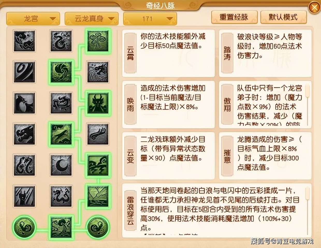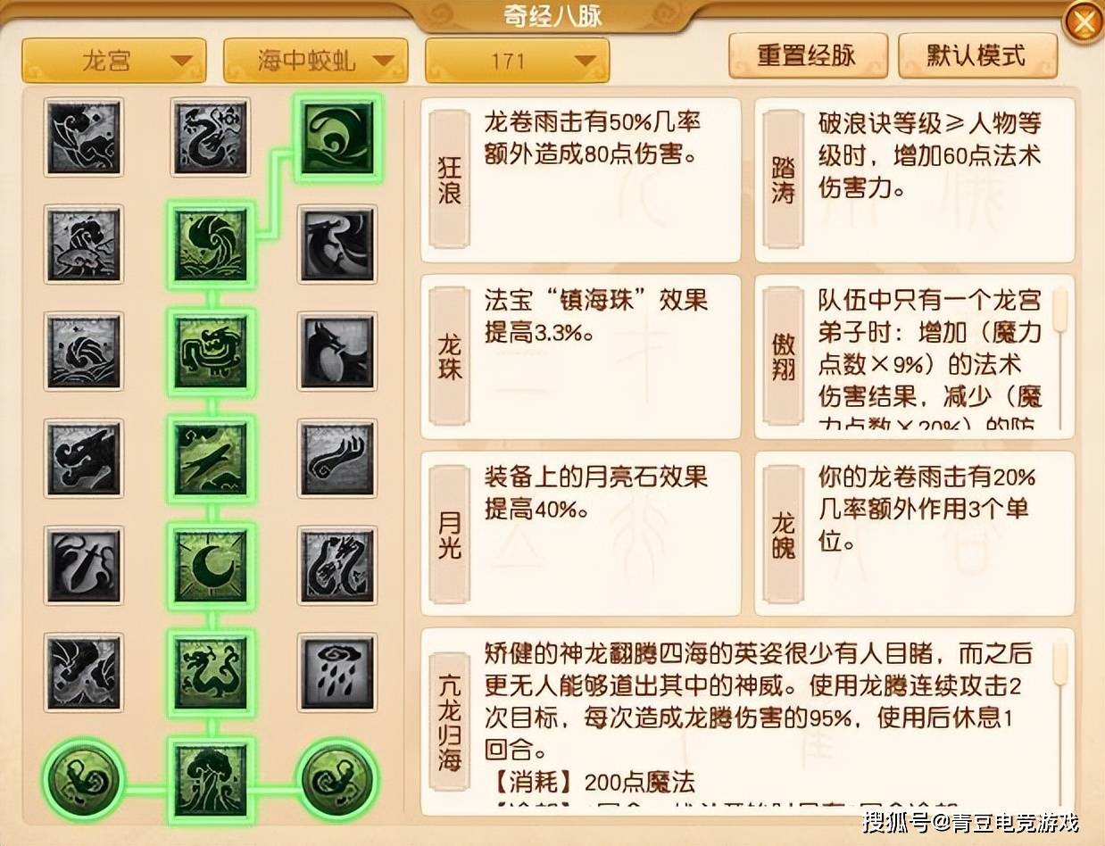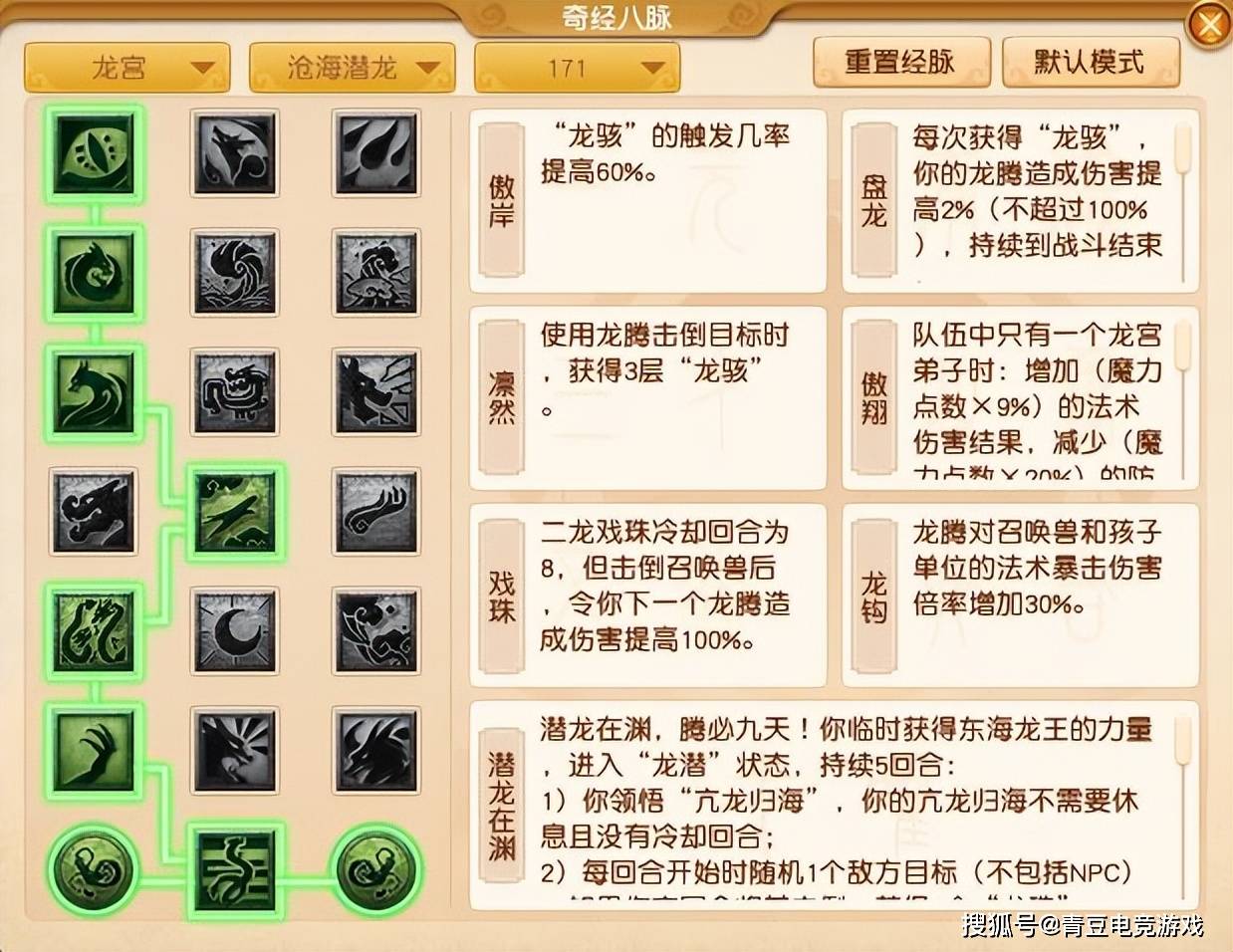 龙宫的这个流派个人觉得走龙骇这个加点很强,因为龙骇带来的增益可是很可观的,感觉这套经脉加点用在PK中,对召唤兽和孩子的输出提升很多,同时需要使用二龙戏珠和龙腾相互的交替使用,可以打出不俗的伤害。