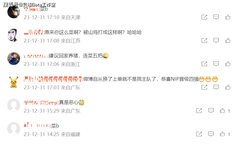同时WBG上单ZDZ的个人微博也被冲了。很多人怒斥WBG太菜了,被山鸡打成这样,连续5局都打得不好,真的恶心。也有人故意恶心人,在评论区表示恭喜NIP晋级德杯四强。