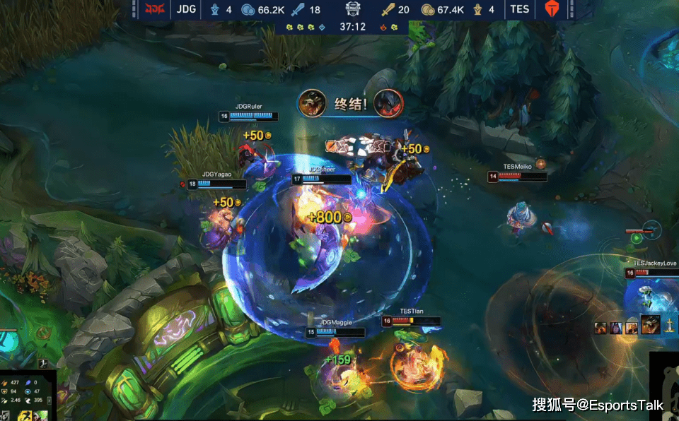 第一局双方就打得非常激烈,一直到中期双方都是很均势的对局,但小天成功抢下那条大龙将局面瞬间改写,可惜这波大龙buff并没有帮助TES成功突破到JDG高地,反倒是在之后的龙魂争夺中TES打得不够严谨,被JDG的打野maggle成功拿下龙魂,之后更是打出完美操作,团灭TES,JDG众人反扑拿下首局。