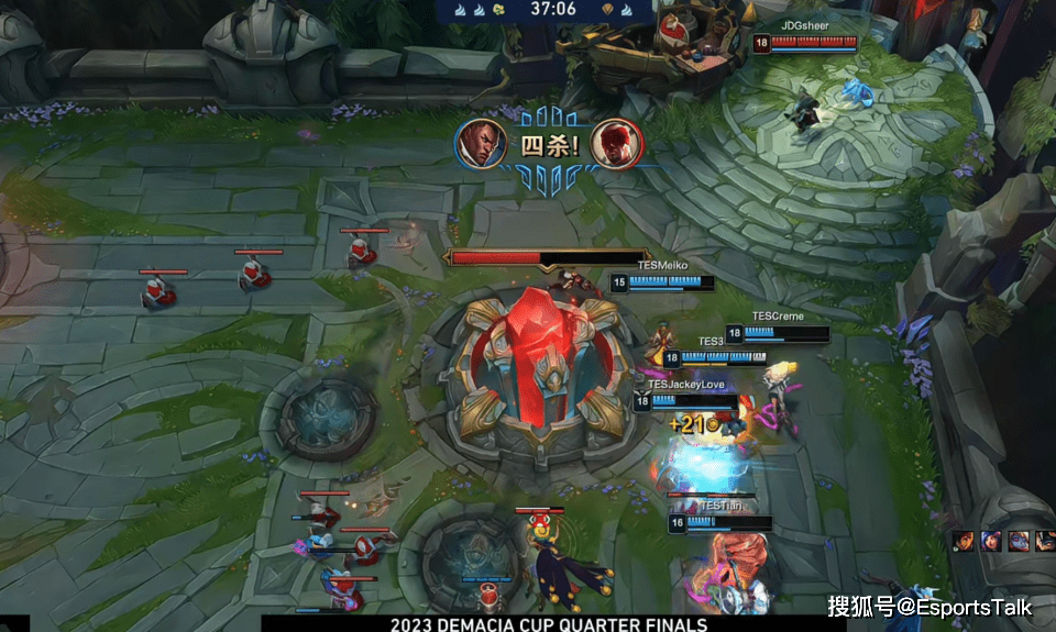 来到决胜局,jkl拿出了自己的招牌德莱文,但前期过得并不好,中期连续几波都被打掉了被动赏金,369也未能在上路有效的限制贾克斯的发育,JDG可以说掌控着绝对的前中期主动权,但在之后的一波上路强抓武器的团战中,TES大获全胜,这波之后双方也是回到了同一起跑线,之后小天更是再度抢下了远古龙,随着后续拿下大龙,TES也是重新掌握主动权,然而在第二条远古龙的争夺中,双方互相冲阵对面的后排,可有着贾克斯的JDG显然更加的有效果,在打出了一波1换4后,JDG也拿下了双龙汇,最终靠着远古龙的尾巴,拿下这场对决,成功晋级四强。