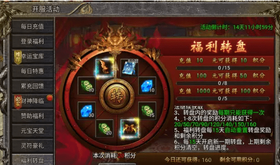 福利转盘是一个积分抽奖活动,在这个转盘中,玩家可以通过消耗积分进行抽奖。每次抽奖所需的积分逐次增加,需要20、50、70、90、120、140、150、160积分。积分可以通过冲制获取,不同金额的冲制会赠送对应数量的积分,例如10园冲制获得20积分,100园冲制可获得50积分,1000园冲制可获得100积分。